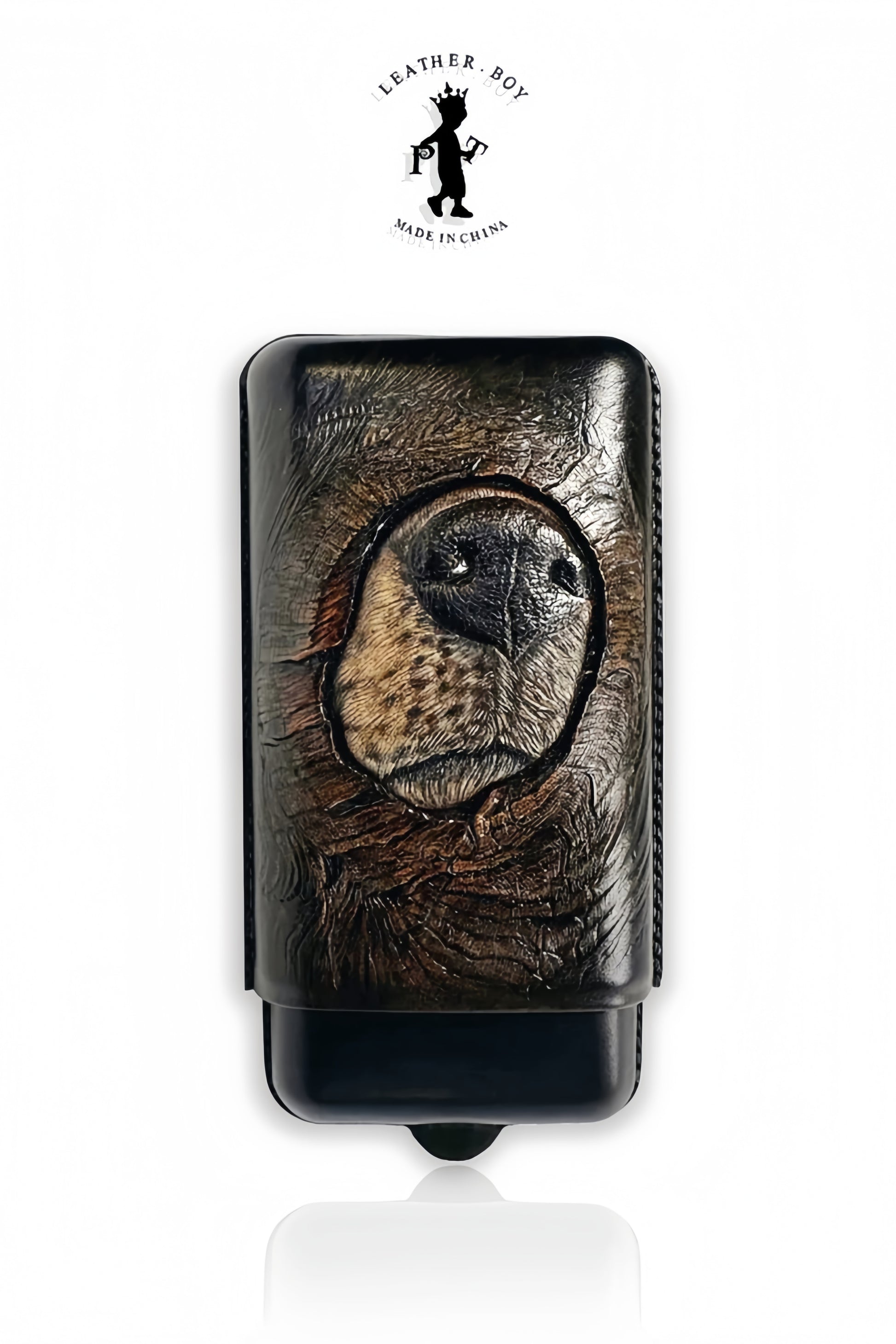 Pure hand-carving craftsmanship lies at the soul of this cigar case. Skilled artisans use a knife as a pen to meticulously carve every detail into the vegetable-tanned cowhide. In Chinese traditional culture, the dog symbolizes loyalty, warm companionship, wealth attraction, auspiciousness, and serves as a totem of virtue. The imposing manner of the dragon is presented in a realistic style, with every detail vividly brought to life under the artisan's blade. It takes days to complete a single piece. The three-dimensional carving makes patterns leap onto the leather, creating a strong visual impact.