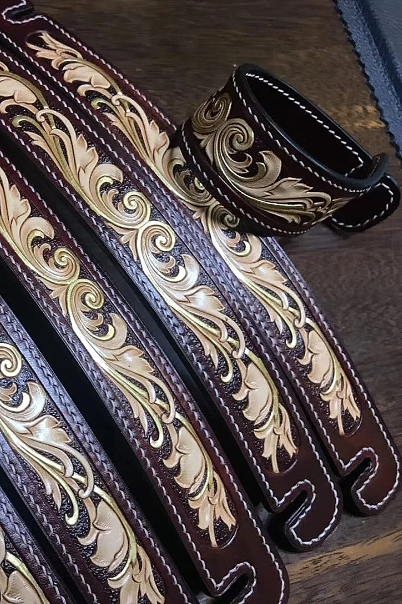1.2-millimeter-thick vegetable-tanned cowhide is selected, which presents a warm beige color after natural drying, and will gradually turn into a deep honey color over time. Craftsmen carve patterns by hand using techniques such as knife carving and stamping. Each line carries the warmth of handcraft. The edges are treated with a edge-wrapping process, forming a neat contrast with the soft lines of the carvings, making the toughness of the leather and the delicacy of the craftsmanship complement each other.