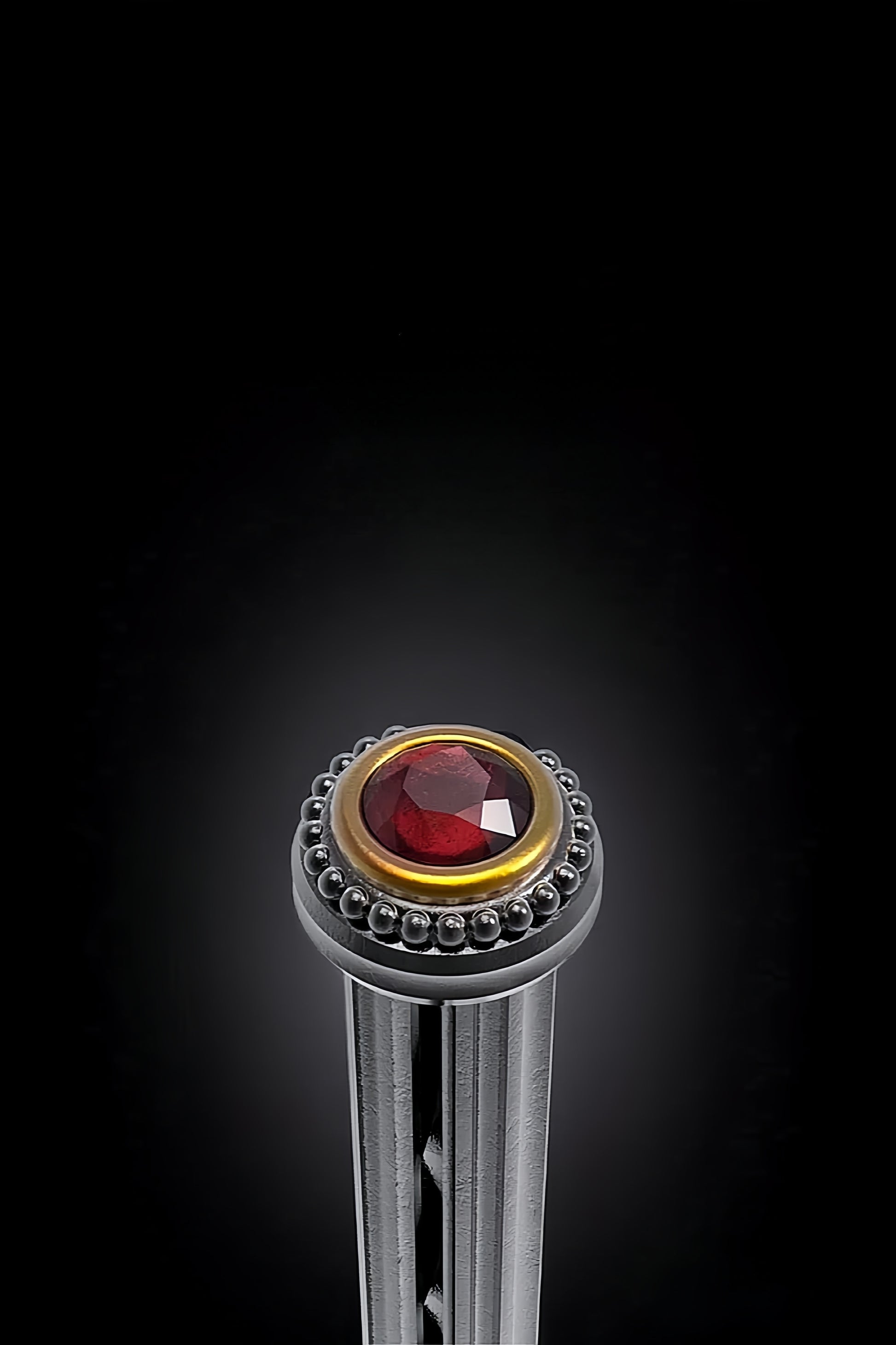 Made of 925 sterling silver through integral forging, it is hand-polished to retain forging traces, showing a warm and time-honored feel. The ruby is fixed with a claw setting, and the metal claws blend with the patterns on the column top, ensuring stability without damaging the overall look. Silver and gemstones complement each other with hardness and softness.